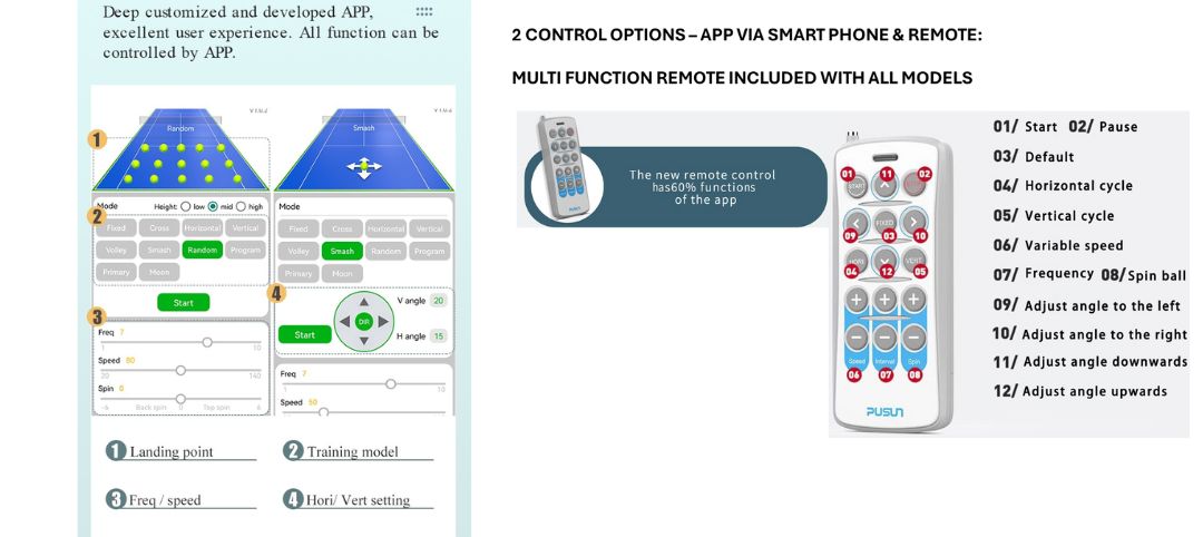 - Featuring diverse launch options including fixed point, horizontal and vertical oscillation, deep and short balls, two-line, cross ball, random ball, lob, topspin, and backspin effects.